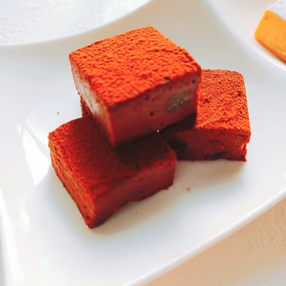 クーベルチュールスイートチョコにオレンジのジャムとピールを加えたほろにが生チョコです。大きめのピールが入っているので、しっかりとオレンジを味わっていただける一品に仕上がりました。
